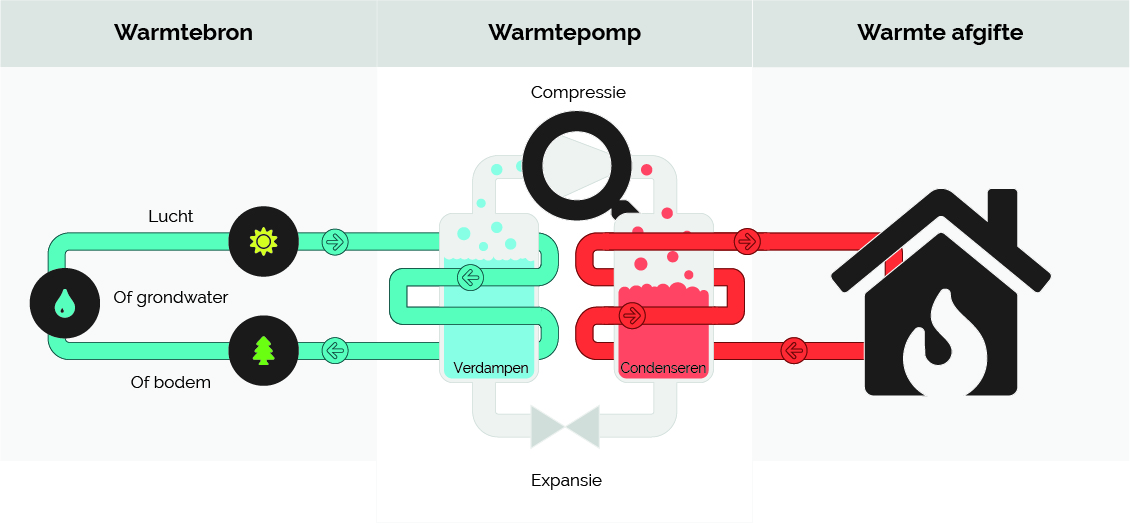Een warmtepomp wordt vaak vergeleken met een omgekeerde koelkast. Simpel gezegd: de warmtepomp onttrekt warmte uit een bron; dat kan bijvoorbeeld de buitenlucht zijn, of het grondwater. Die warmte wordt vervolgens gebruikt om de woning te verwarmen. De meeste warmtepompen zorgen tevens voor warm water. Veel moderne warmtepompen zijn overigens in staat om zowel te verwarmen als te koelen. Dat betekent dat u ’s winters kunt verwarmen en ‘s zomers kunt koelen, gewoon met één apparaat.